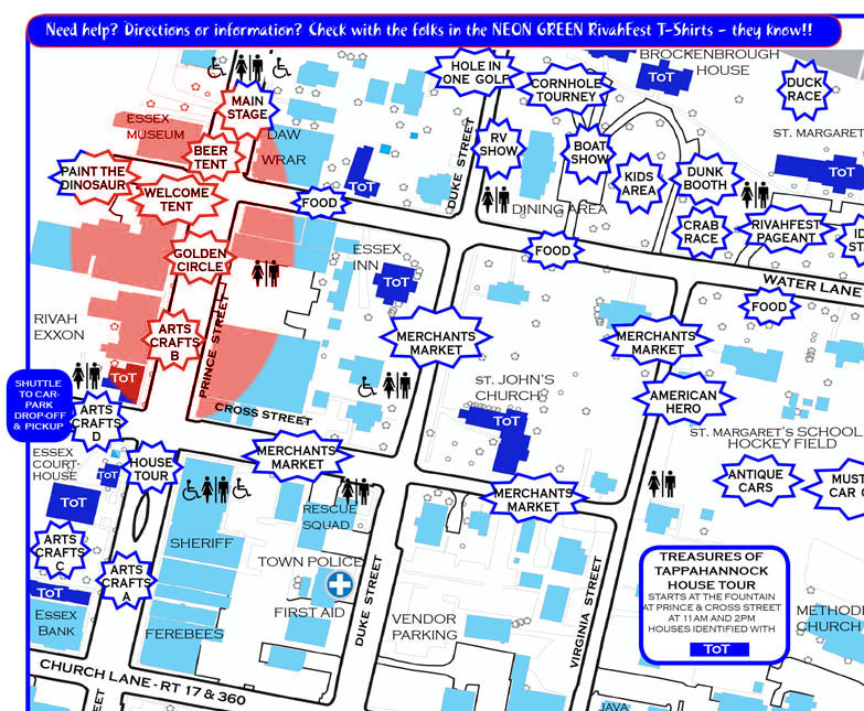 The Golden Circle is the area of RivahFest designated for the late afternoon and early evening events. Vendors in other areas will close at 5:00 p.m. The Golden Circle features the main stage and the last three hours are dedicated to the main band performance, along with the beer and wine garden, and selected Tastes of Tappahannock food vendors who have contracted to stay open until close of the Festival. The Welcome Tent and other booths with RivahFest memorabilia and gifts will also stay open in the Golden Circle.
