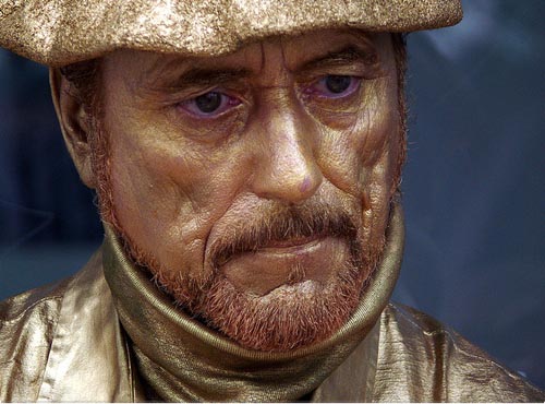 Sitting on a pedestal, dressed in a costume and wearing heavy theater makeup,