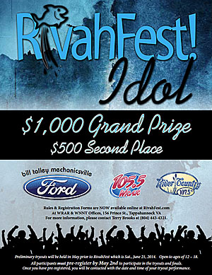 From 11:00 am until 12:00 noon will feature the RivahFest Idol competition hosted by WRAR and WNNT with a doubled value prize of $1,000 sponsored by Bill Talley Ford of Mechanicsville and a $500 sponsored by Tappahannock RivahFest for second prize... jump to the RivahFest Idol page