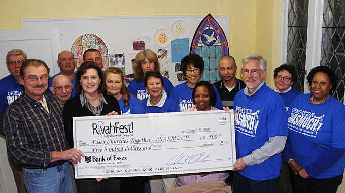 Essex Churches Together INASMUCH planning team accepts a $500 RivahFest Grant check. From left to right front row: Jeff James (RivahFest Planning & Liaison), John Hardy, Sharon James (RivahFest Steering Committee), Hannah Healy, Kathy Hughes (ECT representative), Anita Latane, The Reverend Ken Wilbur (Chairman of the OIAM Planning Team); Back row: Dick Flaherty, Mike Hartenbach, Joe Hartenbach, Dawn Douglas, Sandy Baytops, Stanley Clarke (Sheriff of Essex County), Reverend Dr. Candine Johnson, Sylvia Allen. Not pictured: Alice Roye, Carmen Sandlin, Brooke Carillo, and Bruce McComb. |